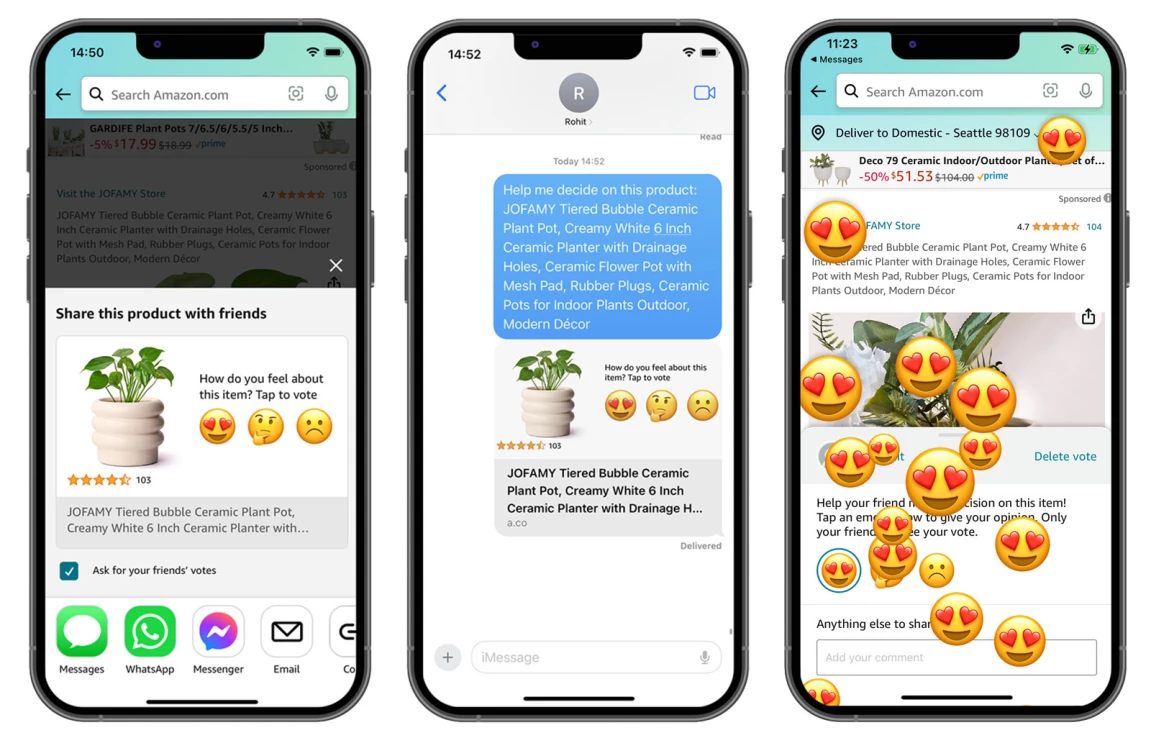 Müştərilər alış qərarı verərkən müxtəlif mənbələrə müraciət edirlər, dost və ailənin tövsiyələri çox vaxt ən etibarlı mənbələr arasındadır. Amazonun araşdırmalarına görə müştərilər sifariş etmədən öncə başqaları ilə almaq istədikləri məhsul paylaşırlar. Amazon müştəriləri mesajlaşma xidmətləri, sosial media proqramları və e-poçt vasitəsilə məhsulları paylaşmaq üçün Amazon Shopping proqramında “Paylaş” düyməsini milyardlarla dəfə istifadə ediblər.