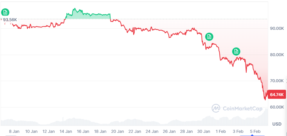 Coinmarketcap-ın toplanmış məlumatlarına əsasən, bitcoinin məzənnəsi 64,74 min dollar təşkil edir. Sutka ərzində qiymət demək olar ki, 9% ucuzlaşıb.